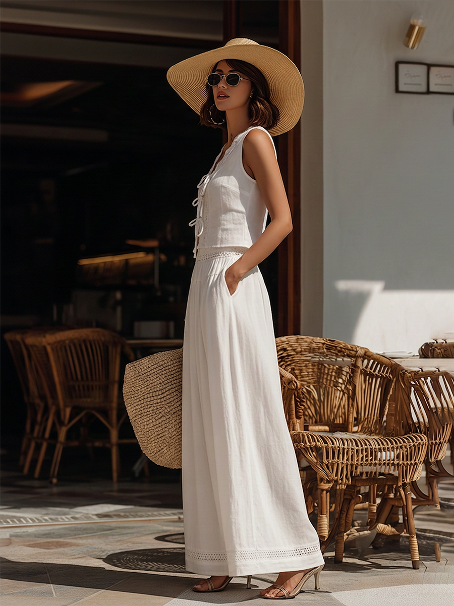 Bohemian Lace-Trimmed Sleeveless Tie-Front Top And Wide-Leg Pants White Cotton Set