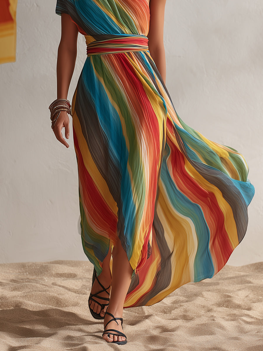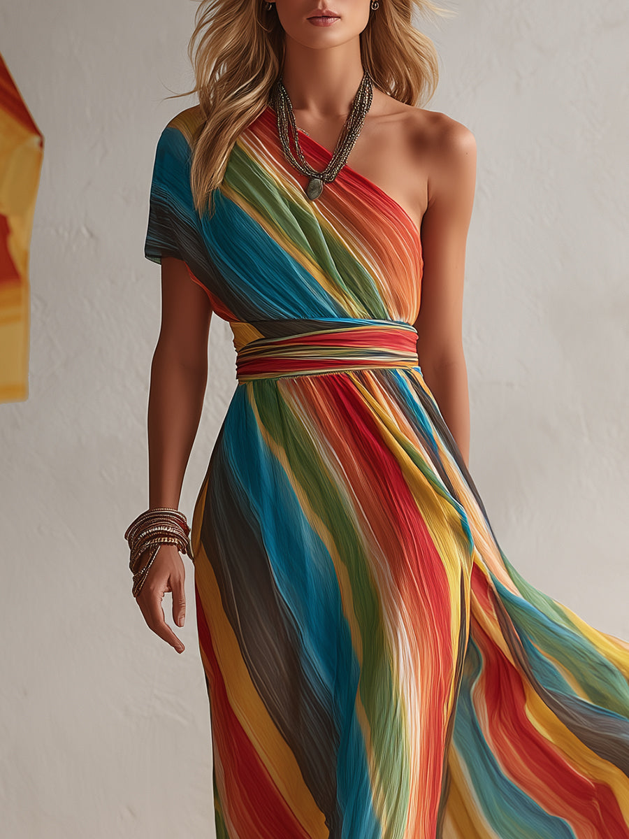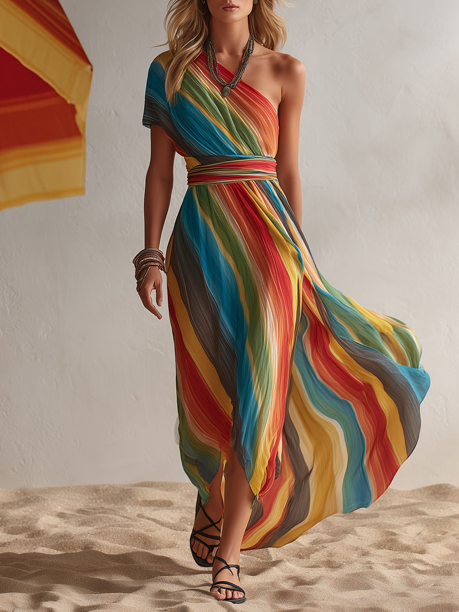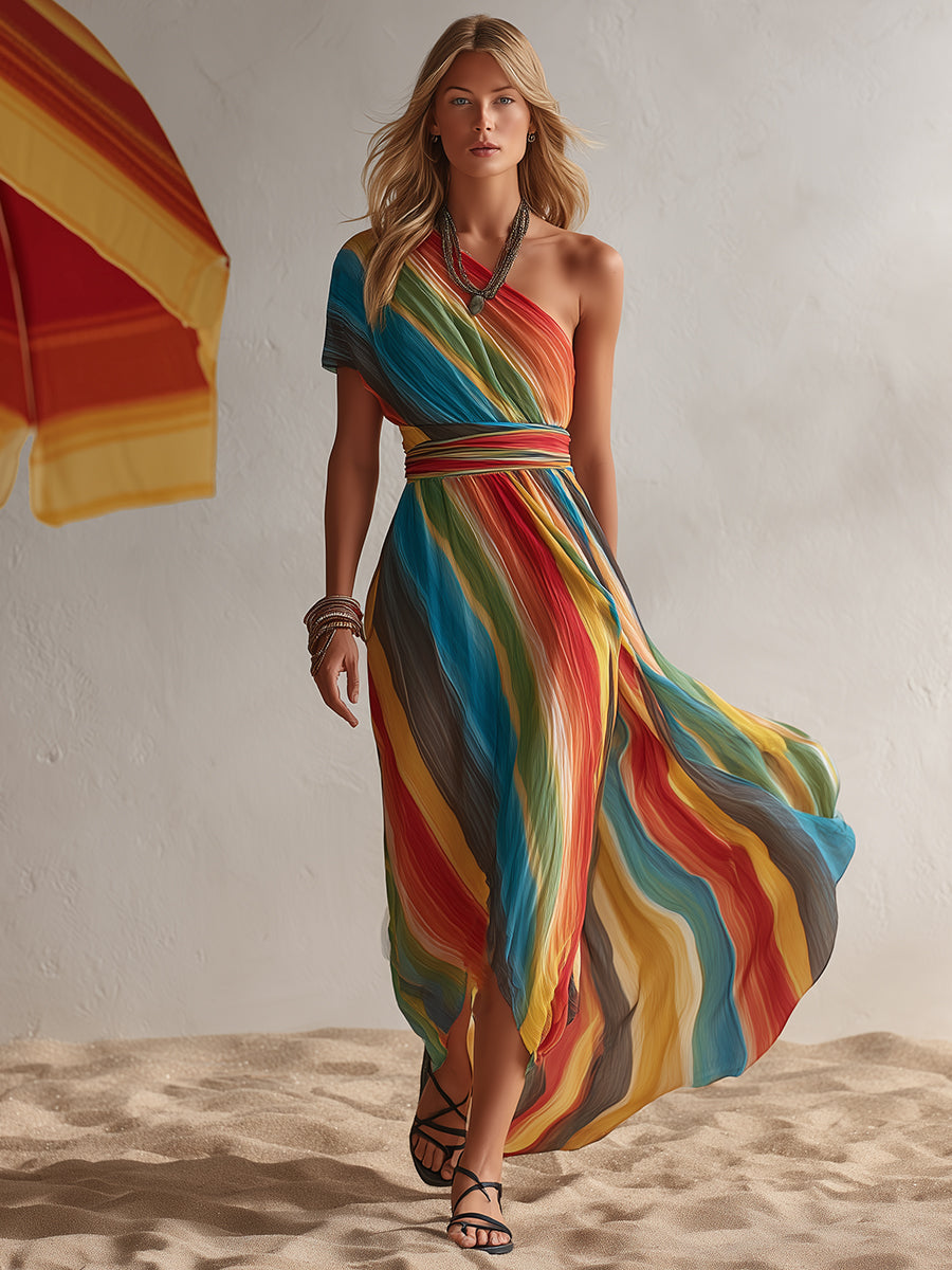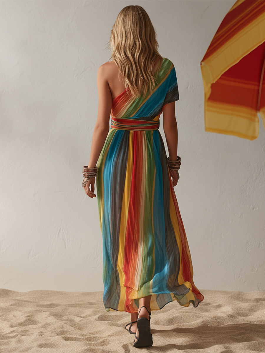 This bohemian-style resort rainbow striped chiffon one-shoulder maxi dress is a stunning fashion piece to add to your wardrobe, helping you easily create a unique look. The charming one-shoulder design adds an elegant and sophisticated touch. The lightweight chiffon fabric provides a breathable and comfortable wearing experience, allowing you to effortlessly showcase your fashionable charm.