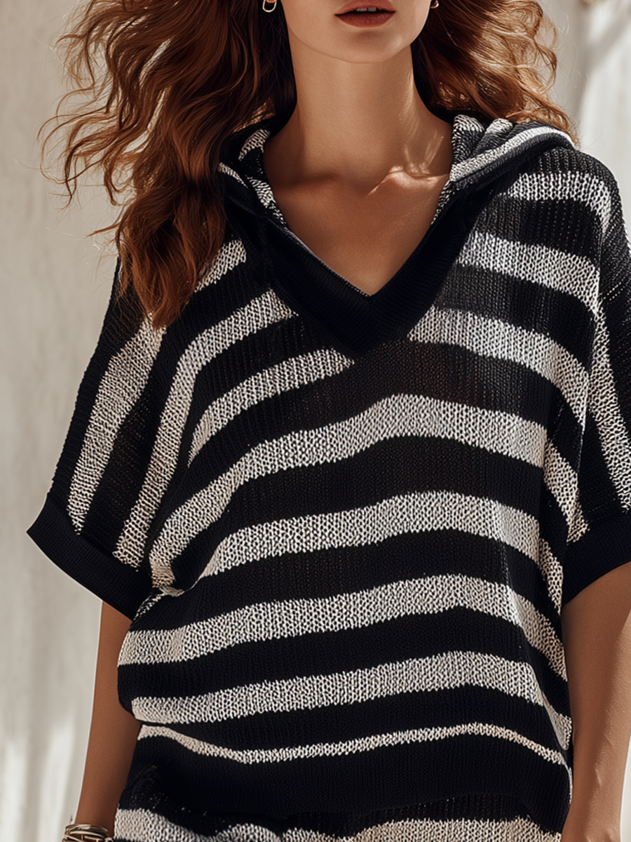 This casual beach set combines comfort and style with a relaxed, sporty edge. Crafted from a soft, breathable knit, it features a black‑and‑white striped short‑sleeve hooded top and matching shorts for an effortlessly coordinated look. The lightweight texture makes it ideal for seaside strolls, lounging, or travel days.