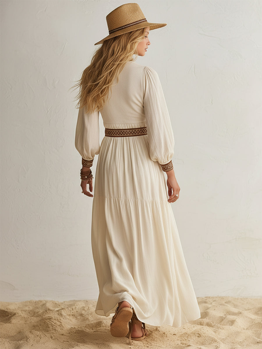 Casual Bohemian V-neck Brown Embroidered Beige Cotton Linen Long-Sleeved Maxi Dress