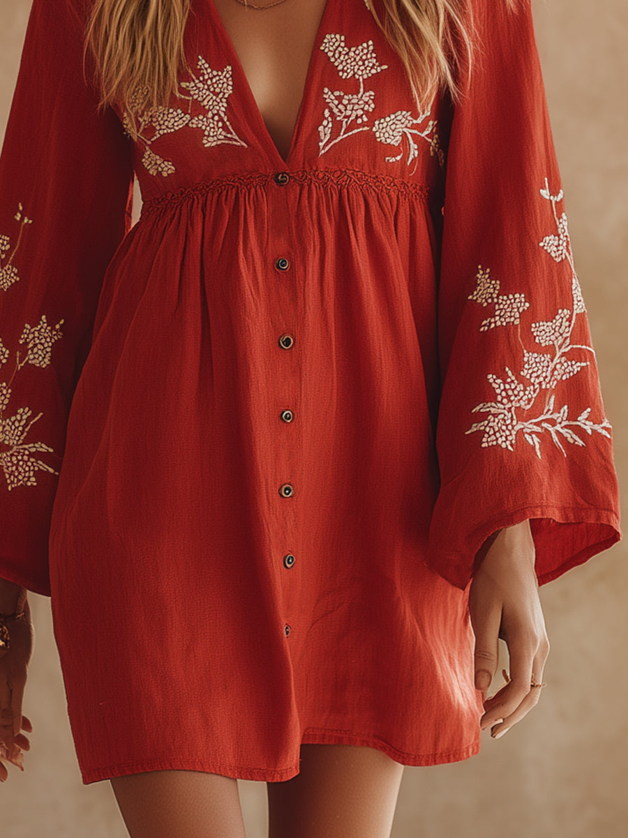 This casual bohemian-style white embroidered red cotton-linen V-neck long-sleeved mini dress is a must-have in any fashionista's wardrobe. Combining comfort, style, and exquisite details, it's the ideal choice for those who want to express their individuality while embracing a relaxed lifestyle.