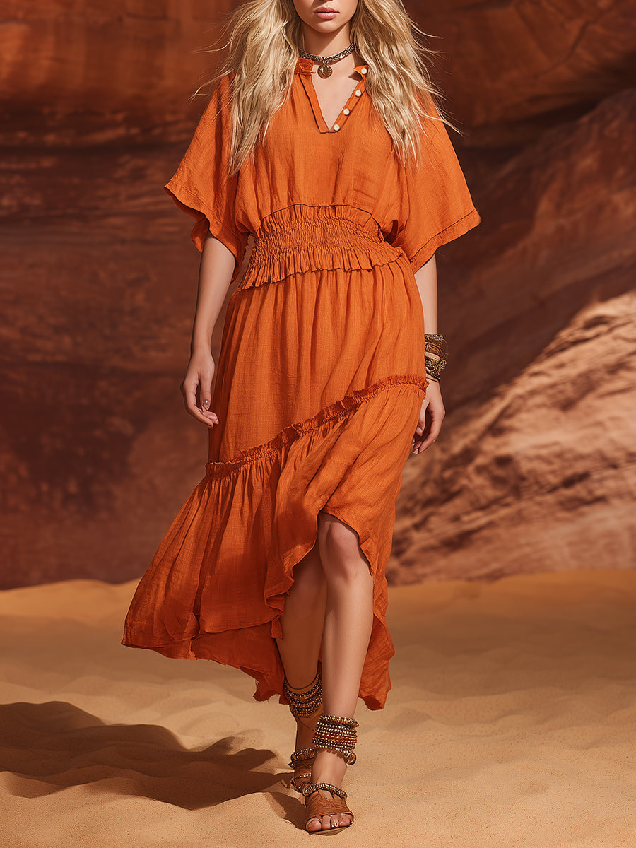This casual resort-style V-neck terracotta orange cotton-linen midi dress with ruffles is a wardrobe essential, combining fashion and comfort. Its versatile design allows you to easily style it for any occasion, making it ideal for various events in warmer seasons.