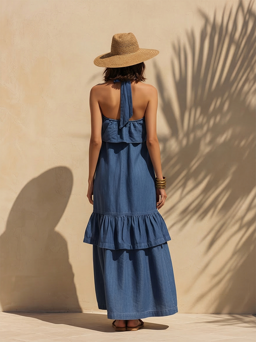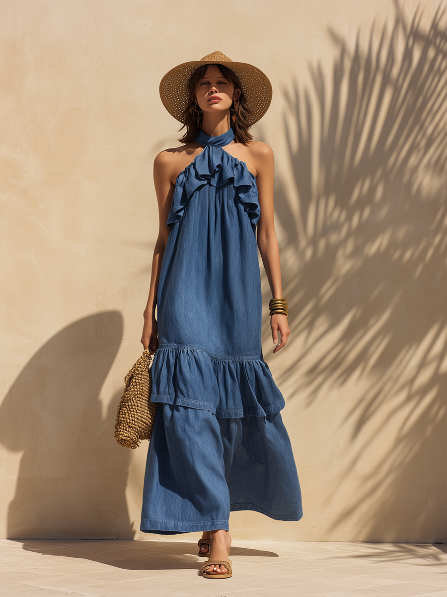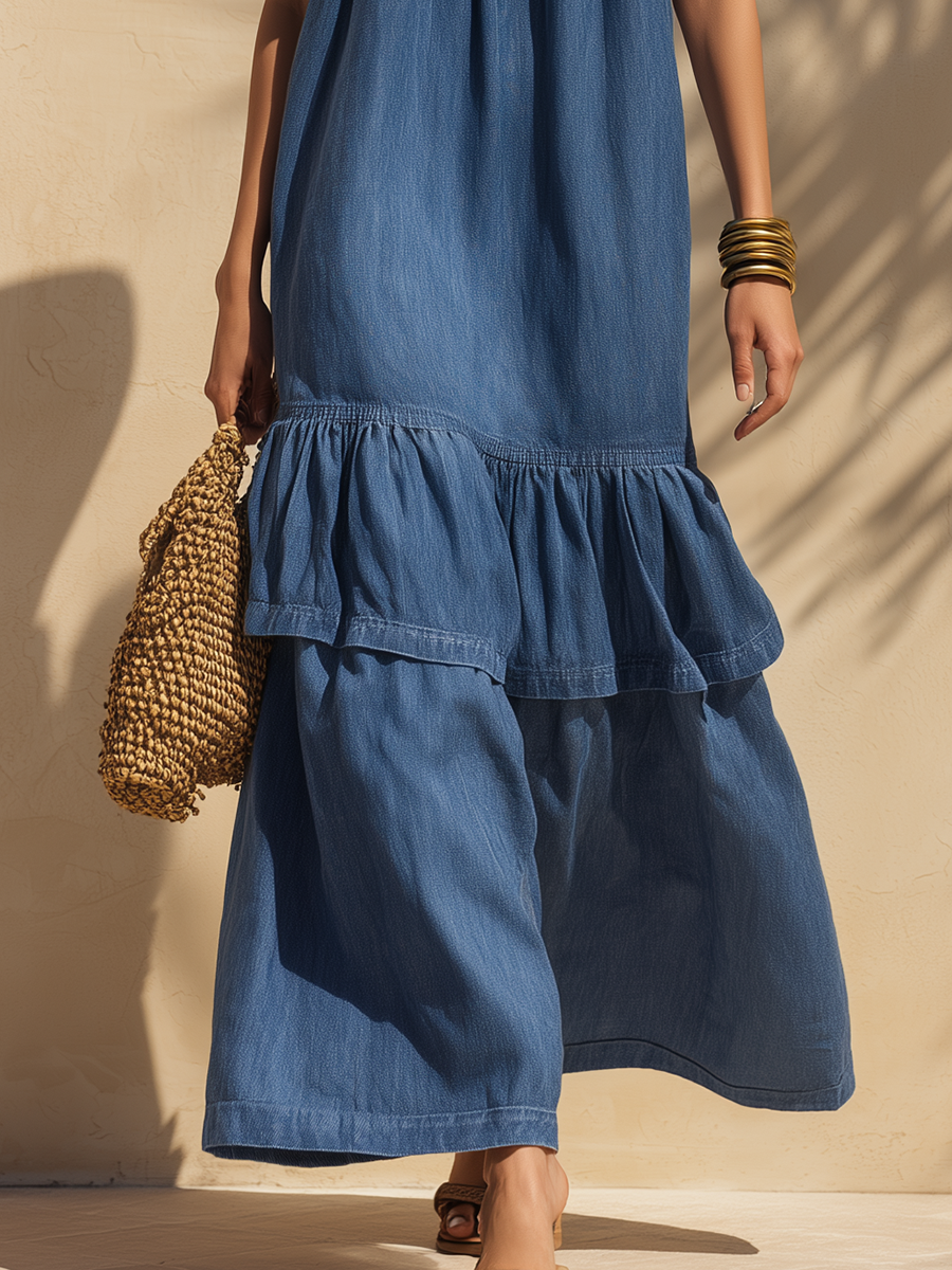 This elegant bohemian maxi dress reimagines denim with a soft, feminine twist. Crafted from lightweight denim for a fluid drape, it features a sleeveless design with delicate ruffle detailing along the neckline or shoulders, adding romantic texture to its relaxed silhouette. The full, sweeping skirt moves beautifully with every step, evoking effortless boho charm.