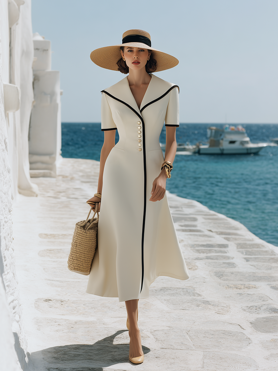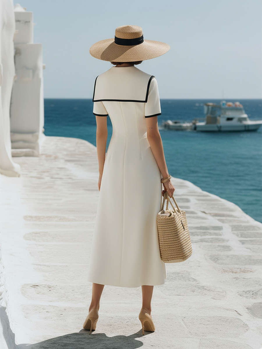 Perfect for seaside strolls, summer gatherings, or casual evening outings, this dress pairs beautifully with loafers or strappy sandals and a simple clutch. Its blend of nautical inspiration and understated elegance makes it a standout piece — relaxed yet polished, effortlessly chic for any occasion.