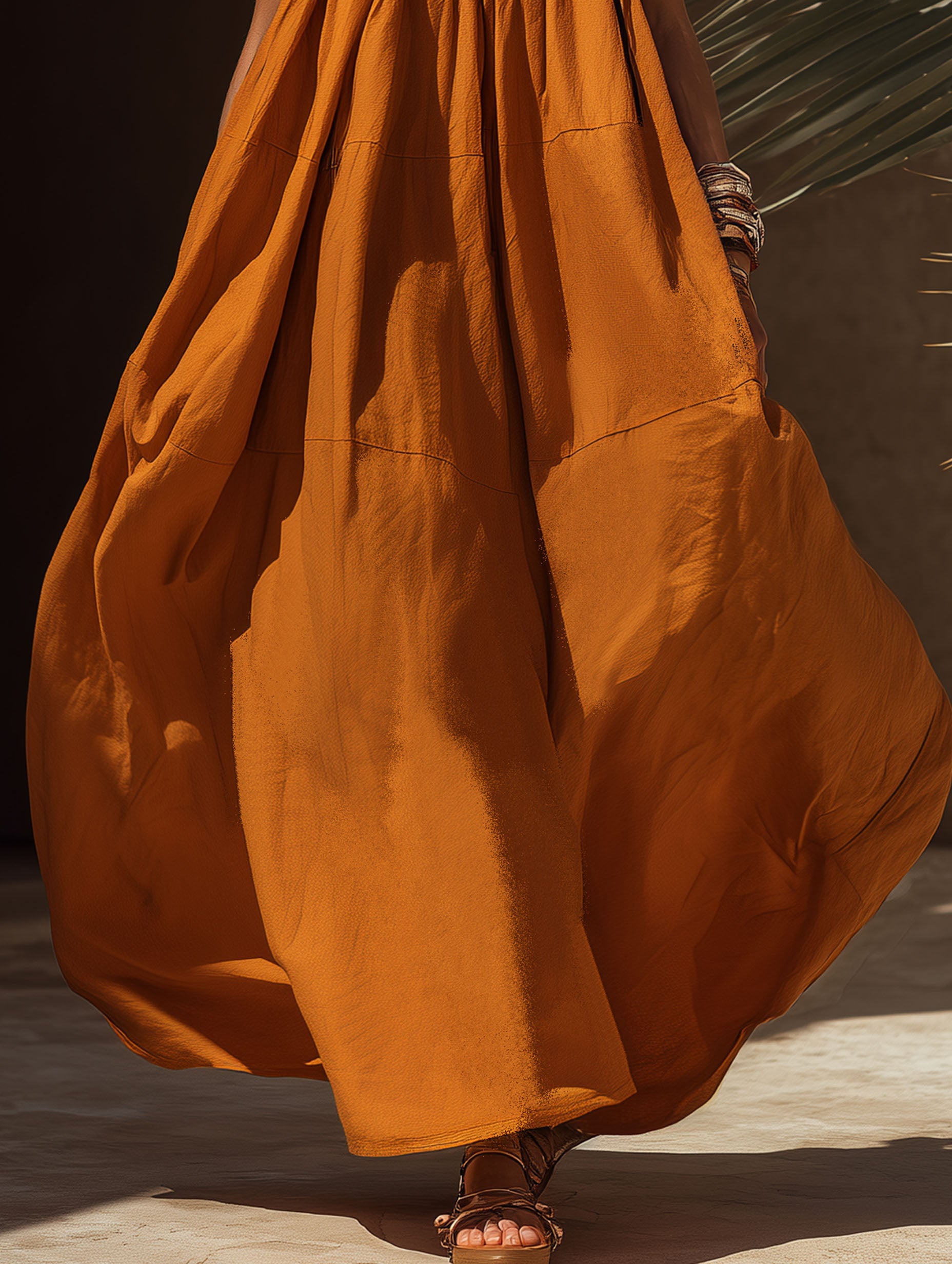 This sun-ready maxi dress in a warm orange cotton-linen blend pairs a softly structured bodice with a flowing ankle-length skirt for an elegant yet relaxed silhouette. A self-tie bow at the waist provides adjustable shaping while gentle gathers add movement; optional details such as a lined bodice, discreet side pockets, and a back or side closure make the design both polished and practical. The textured, breathable fabric offers a natural, lived-in softness that flatters many skin tones and suits seaside dinners, weekend getaways, or everyday summer wear.