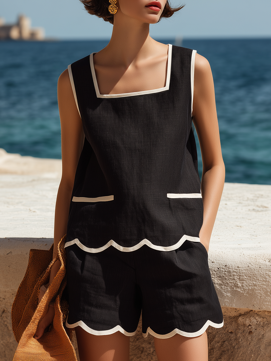 This elegant resort set elevates casual comfort with subtle, eye‑catching detail. Crafted from a breathable cotton‑linen blend, it features a refined black top with soft wavy contrast trim that outlines the neckline and hem for a touch of modern sophistication. The matching high‑waisted shorts mirror the trim for a cohesive and polished look.