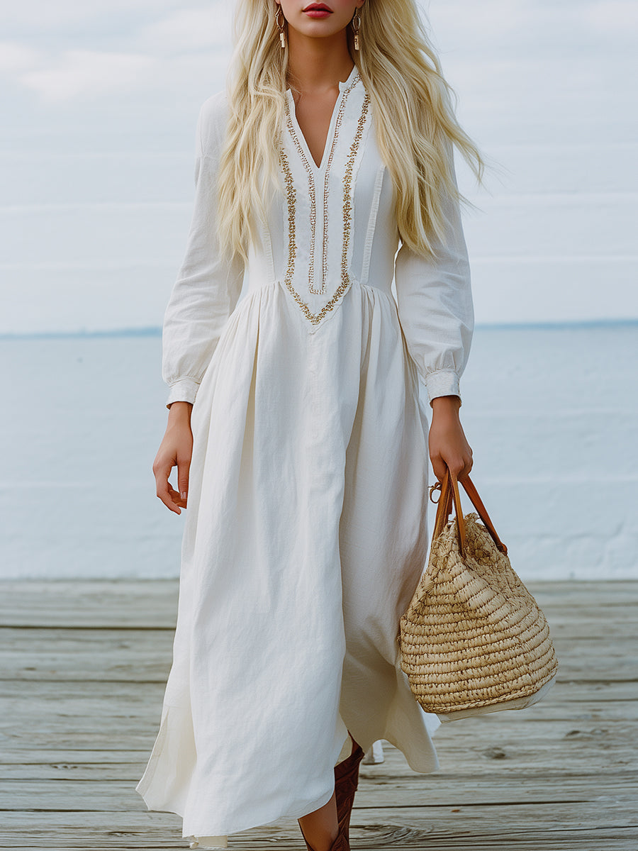 This elegant white cotton-linen embroidered maxi dress exudes a vacation vibe, effortlessly creating a sophisticated and elegant atmosphere. Made from a premium cotton-linen blend, it's comfortable, breathable, and exudes elegance. The pure white base paired with delicate embroidery adds a touch of sophistication to the minimalist design.