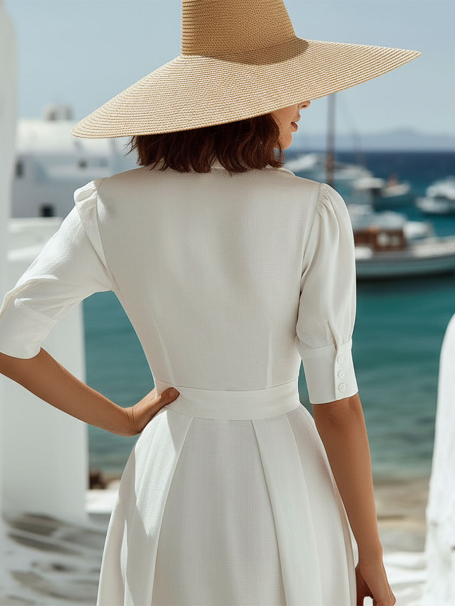 Perfect for resort dinners, garden events, or afternoon strolls, this dress pairs beautifully with strappy sandals, a woven clutch, and delicate gold jewelry. Its combination of crisp tailoring, light fabric, and timeless shape captures the essence of understated vacation elegance.