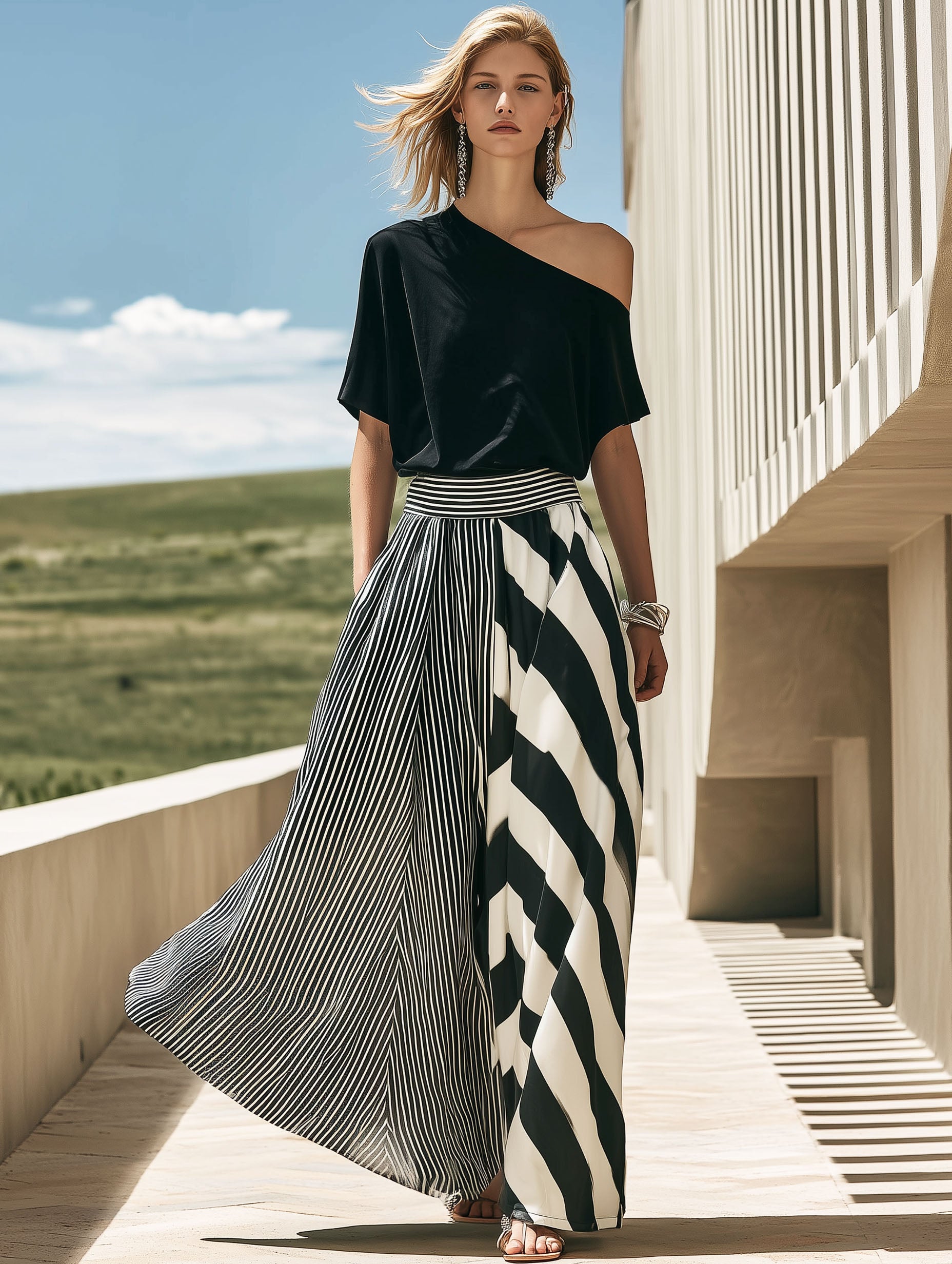 A high-end resort black off-shoulder short-sleeved black and white striped maxi dress set embodies sophistication and effortless elegance. The off-shoulder neckline flatters the shoulders and collarbone, while short sleeves provide a breezy, relaxed feel ideal for warm destinations. The flowing maxi silhouette combines timeless black and white stripes—either vertical for a lengthening effect or horizontal for a bold statement—crafted from luxurious, breathable fabrics such as silk blends or fine cotton. Designed as a matching set, it may include coordinating pieces like a chic belt or light cover-up to complete the refined look.