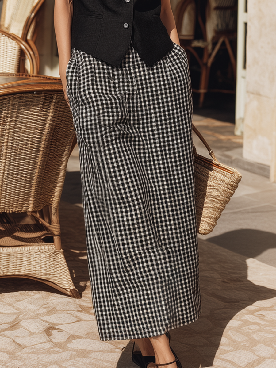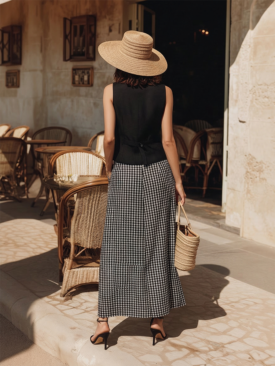 This light‑luxury resort set combines classic tailoring with relaxed refinement. The black vest, cut from a soft cotton‑linen blend, features a streamlined silhouette with subtle structure, offering a polished yet breathable fit. It pairs effortlessly with the coordinated plaid skirt—patterned in understated neutrals—for a gentle contrast and touch of preppy sophistication.