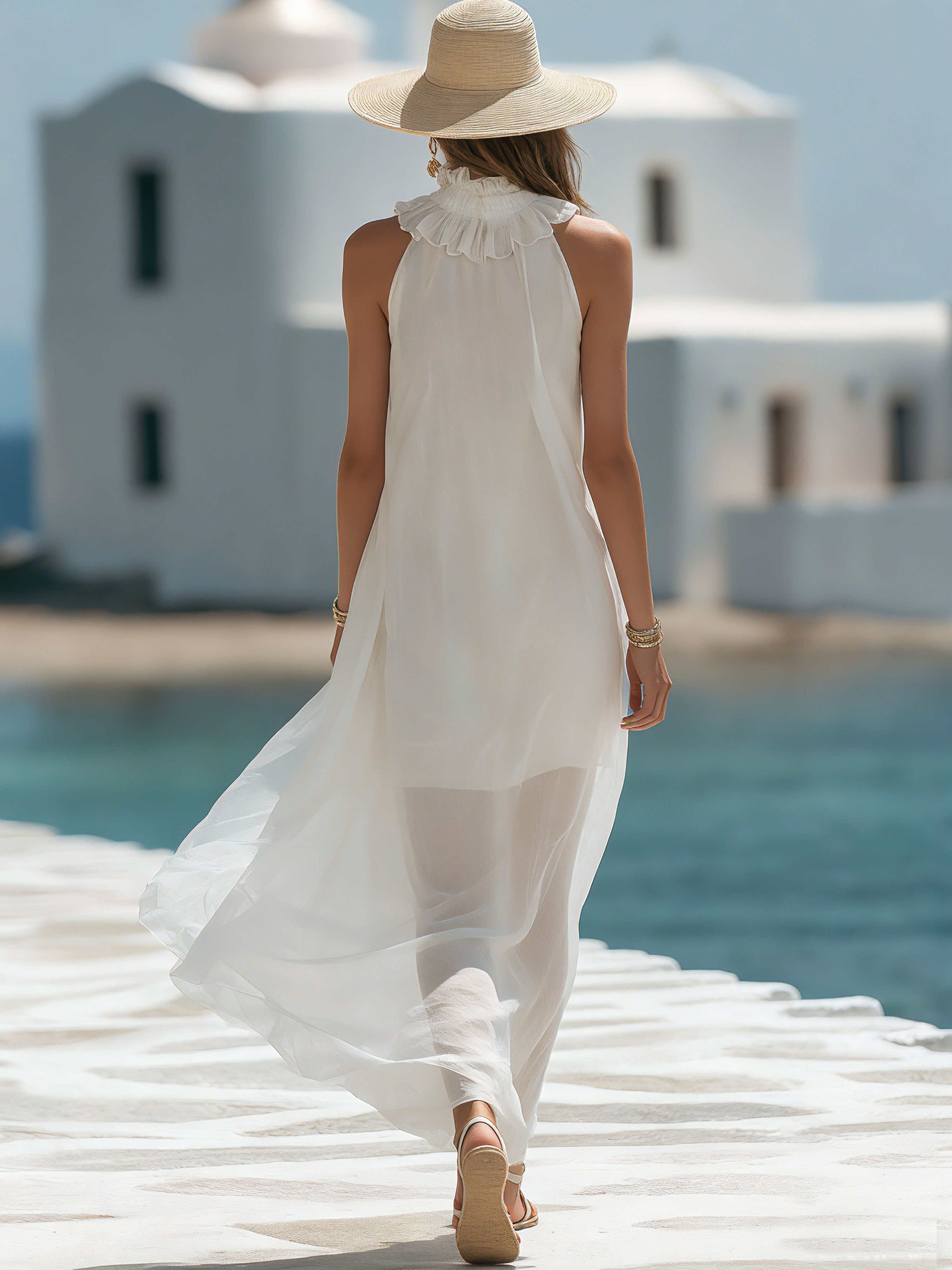 Style it with flat leather sandals and a straw tote for daytime ease or metallic heels and statement earrings for evening; layer a cropped blazer or linen jacket for cooler nights. Care: gentle hand wash or machine wash in a mesh bag, hang or lay flat to dry, steam or cool iron as needed. Fit notes: relaxed, flowing cut—take your usual size for the intended drape. Tags/SEO: white chiffon maxi, sheer dress, tie neckline, resort wear, vacation dress, lightweight evening gown.