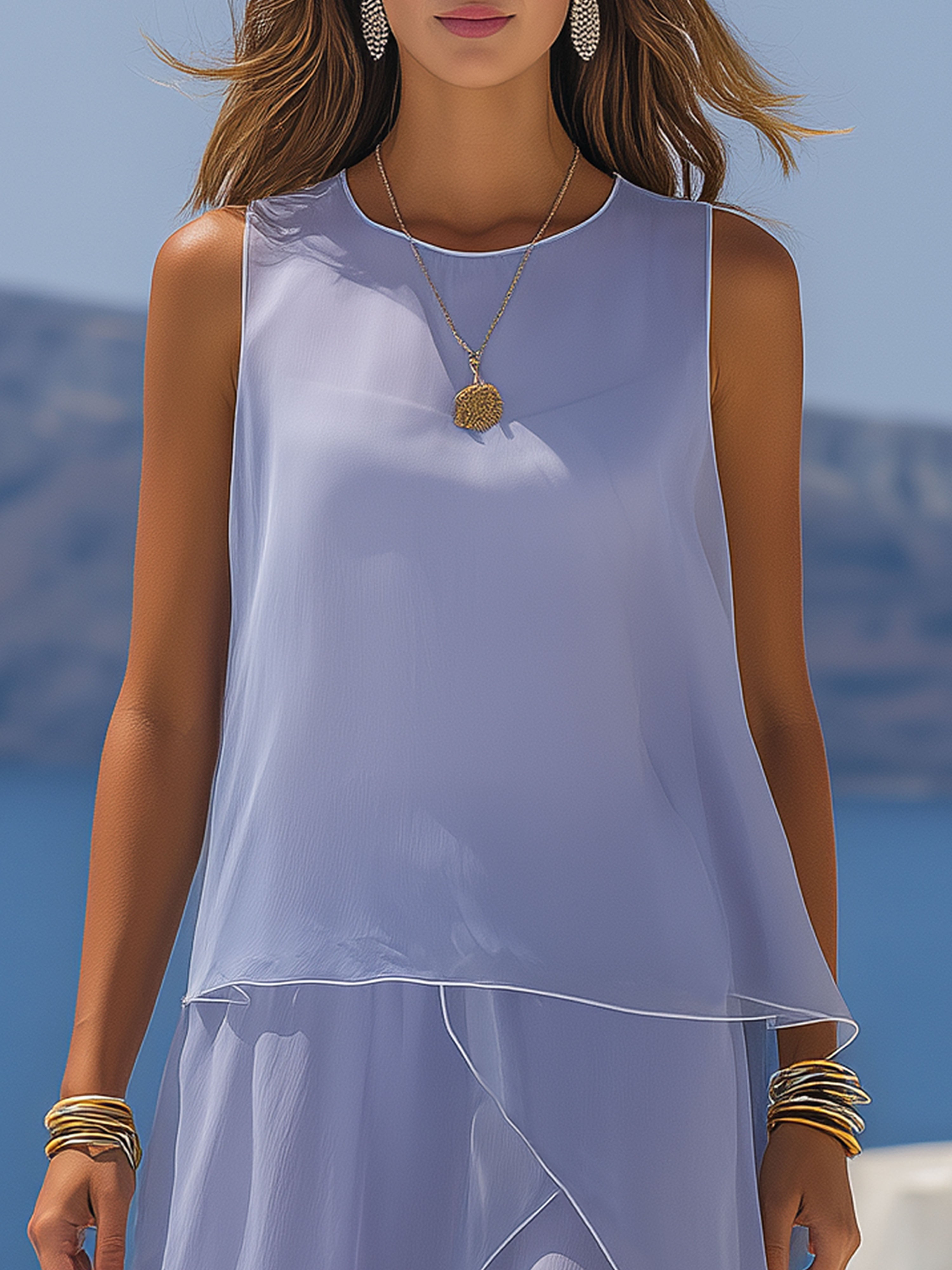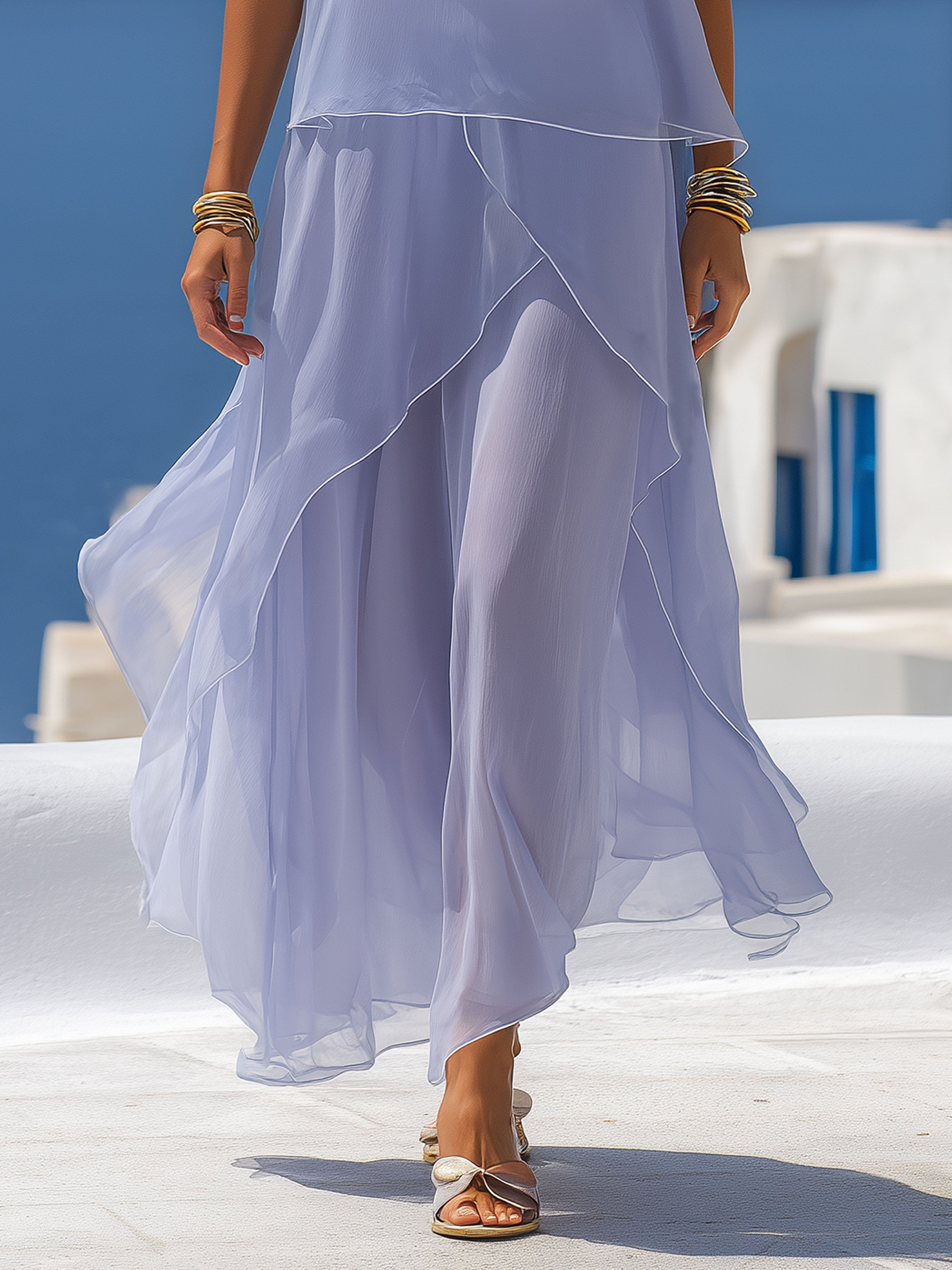 Style it with flat leather sandals and a straw tote for daytime ease, or elevate with metallic heels and statement earrings for evening. Care: gentle hand wash or machine wash in a mesh bag, hang or lay flat to dry, and steam or cool iron as needed. Fit notes: designed for a relaxed, flowing fit—take your usual size for the intended silhouette. Tags/SEO: resort wear, purple chiffon maxi, white trim dress, vacation gown, lightweight, summer evening dress.