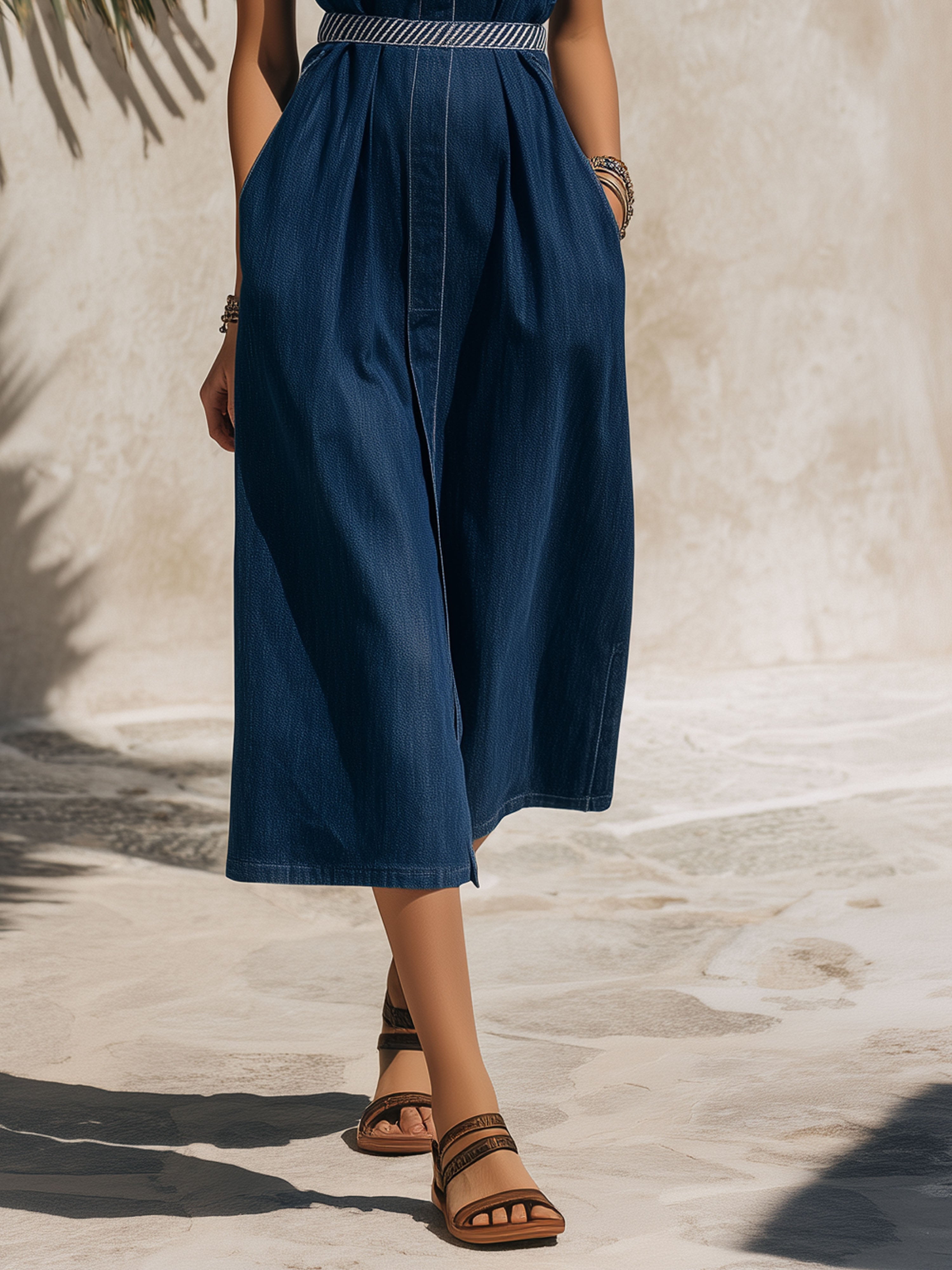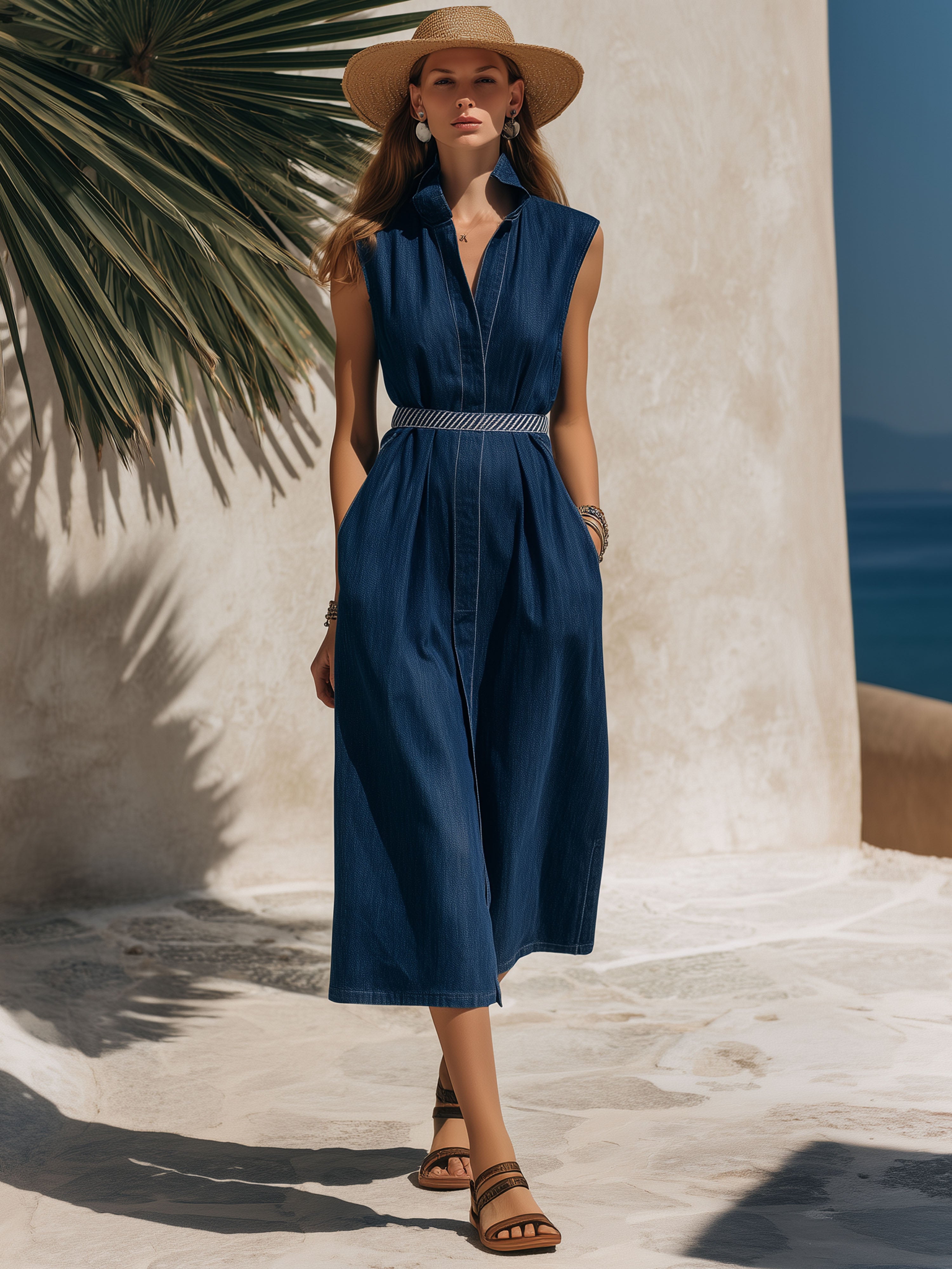 A resort-ready midi cut from soft blue denim, featuring a sleeveless V-neck and modern color-blocked panels that add visual interest and flattering lines. The belted waist defines the silhouette while the mid-calf length offers easy movement and a polished yet relaxed look—perfect for seaside strolls, harbor lunches, or casual evening dinners.