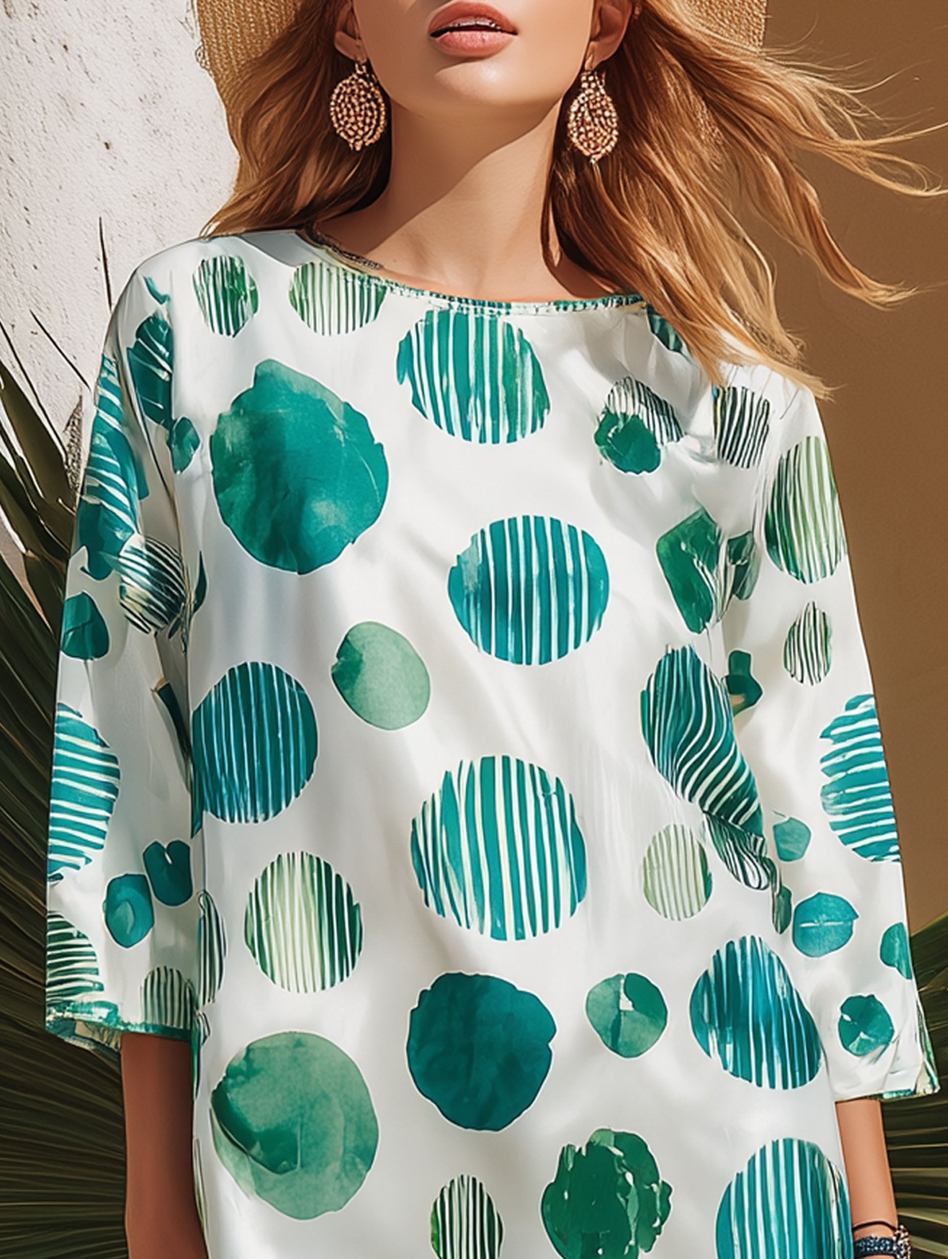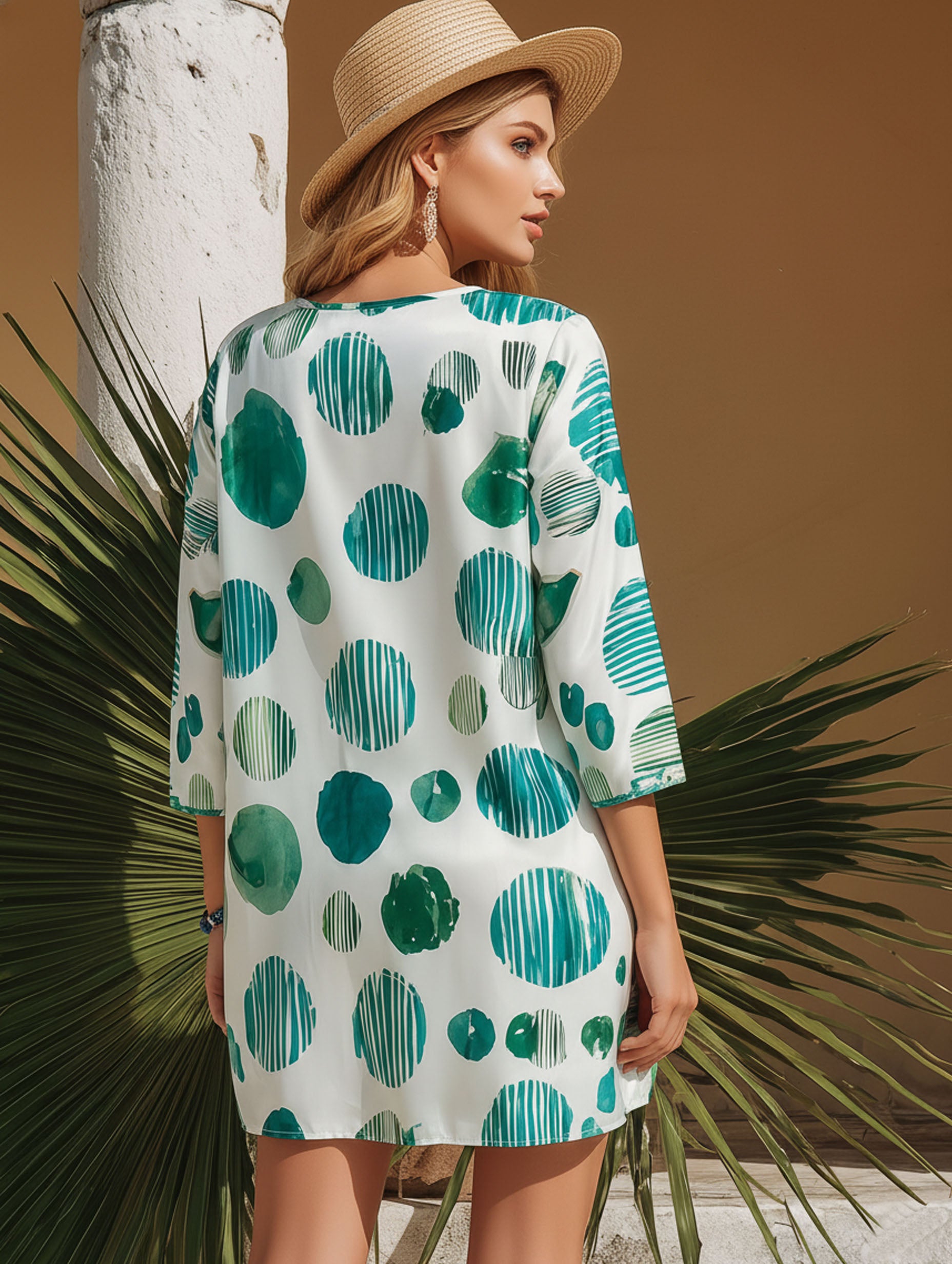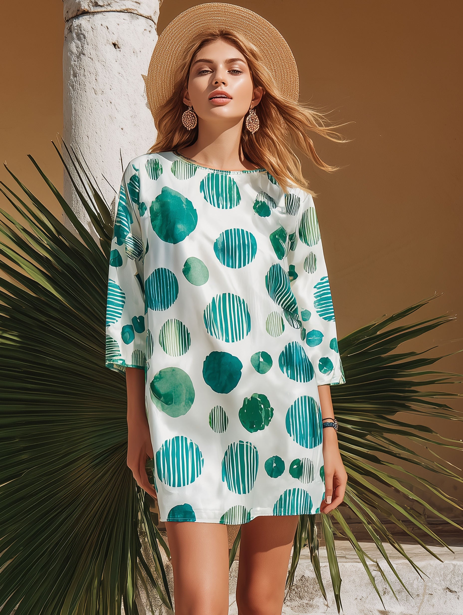 A resort-ready mini dress in lustrous satin, this playful piece features a vibrant green base dotted with crisp white polka dots for a fresh, feminine look. The mid-length sleeves balance coverage and breeziness while the mini hem keeps the silhouette youthful and flirty. The satin’s soft drape and subtle sheen catch the light for an elevated, vacation-ready feel—perfect for beachside lunches, poolside cocktails, or sunset strolls.
