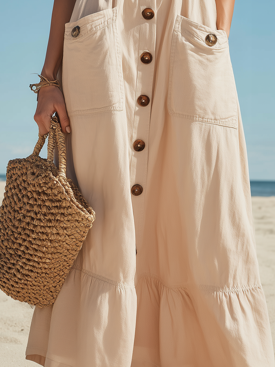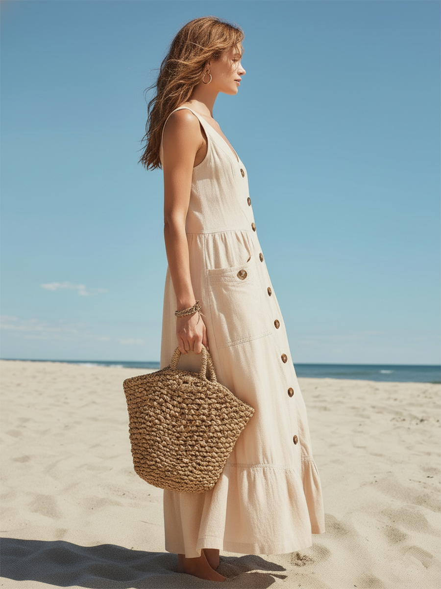 This elegant and classic resort-style maxi dress is made from soft, breathable fabric in a sophisticated off-white hue. The alluring V-neck and button-down front accentuate a flowing feminine silhouette, while the floor-length skirt allows for effortless movement. The lightweight and breathable fabric makes it ideal for a warm getaway, a resort dinner, or a leisurely beach stroll.