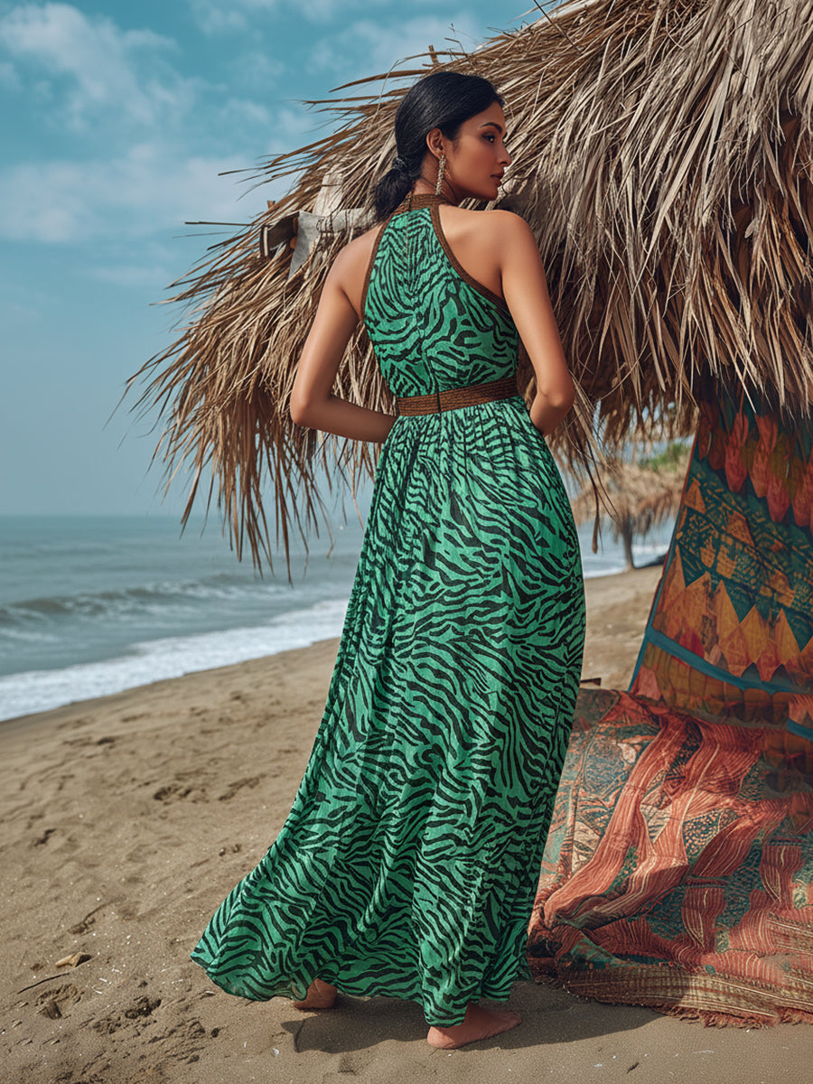 This retro Bohemian maxi dress brings a bold, spirited vibe to vacation and everyday wear. Crafted from airy chiffon, it features a flowing green zebra print contrasted with rich brown trim for a striking, vintage-inspired finish. The relaxed silhouette glides gracefully with every step, offering both comfort and effortless sophistication.