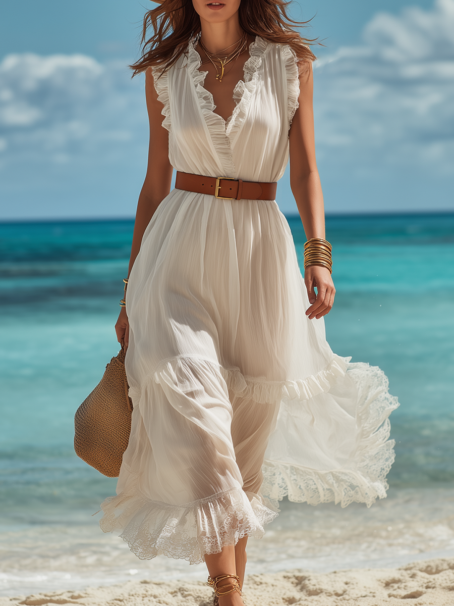 This romantic Bohemian maxi dress captures ethereal charm with its flowing white chiffon and delicate ruffle detailing. The sleeveless design and soft, draped layers create an airy, graceful silhouette that moves beautifully with every step. Light and feminine, it embodies effortless elegance while maintaining a relaxed, free‑spirited essence.