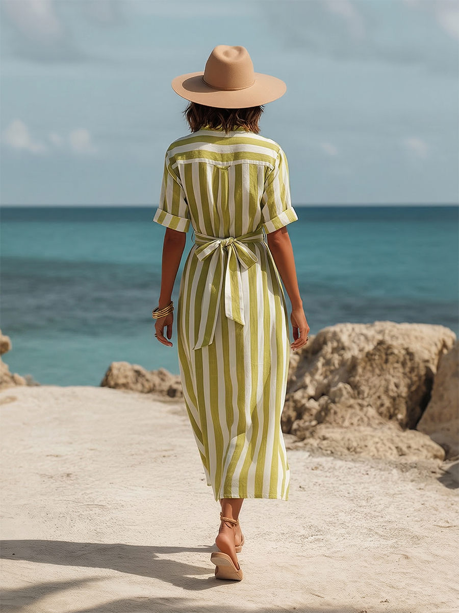 Simple Vacation-style Cotton And Linen Striped Short-sleeved Shirt Midi Dress