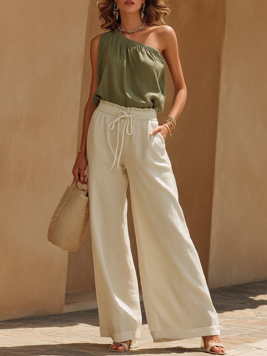 Chic and modern, this vacation‑style set pairs a sleek one‑shoulder top with loose wide‑leg pants for an effortlessly polished look. Crafted from lightweight, breathable fabric, the asymmetrical neckline adds a contemporary edge, while the flowy wide‑leg trousers offer comfort and graceful movement. Perfect for tropical getaways, resort dinners, or sunset strolls, it strikes the perfect balance between relaxed and refined.