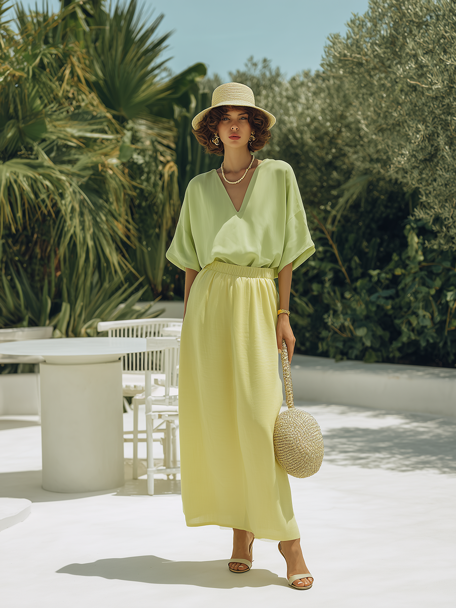 Effortlessly chic and comfortable, this vacation‑style set pairs a V‑neck short‑sleeve top with a coordinating skirt for an elegant yet easygoing look. Crafted from soft, breathable fabric, the top features a relaxed fit and a flattering neckline, while the matching skirt drapes gracefully for smooth movement. Designed for both comfort and style, this set is perfect for sunny getaways, resort brunches, or laid‑back evenings by the coast.