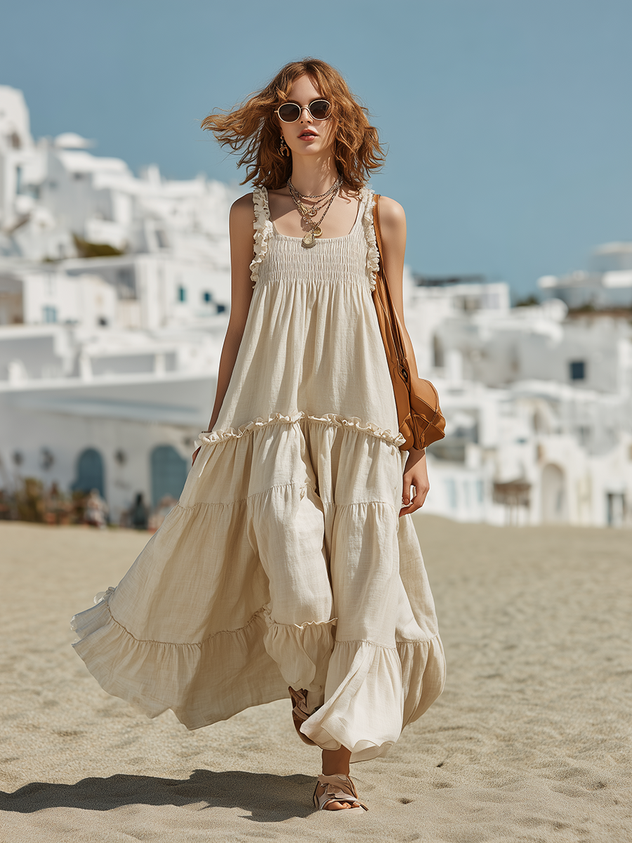 This lightweight and flowing resort-style maxi dress is made from a soft cotton and linen blend fabric, keeping you cool and comfortable in warm weather. The sleeveless, off-the-shoulder design drapes elegantly over the shoulders, creating a feminine and vacation-ready look. The hem falls to the ankles, and the loose silhouette is flowing and graceful, while the natural texture of the cotton and linen fabric adds a touch of effortless elegance.