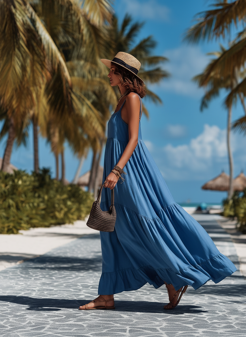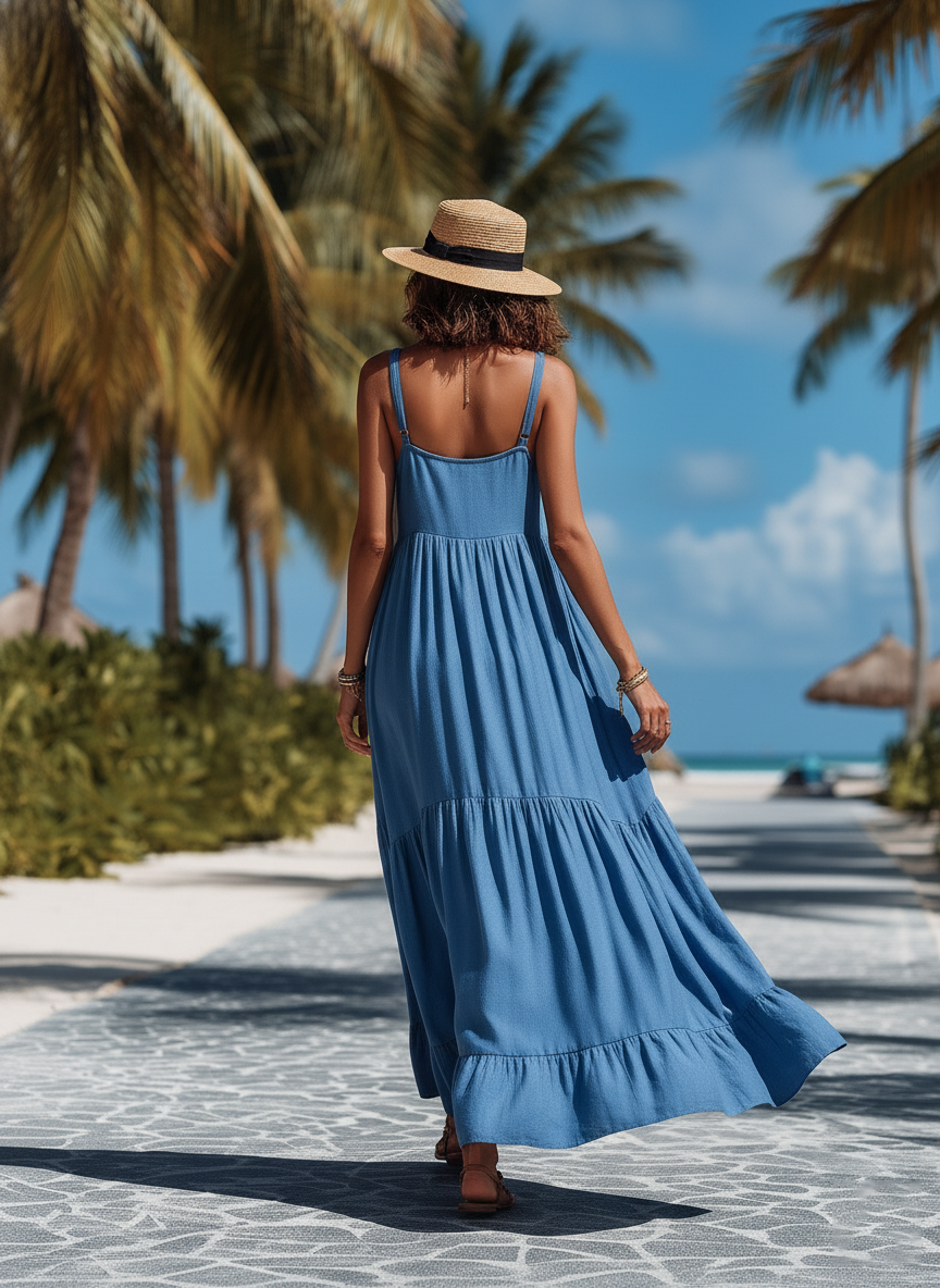 Breezy and elegant, this vacation‑style maxi dress is crafted from lightweight fabric in a serene shade of blue, perfect for sunny getaways. The strappy design highlights the shoulders and neckline, while the loose, flowing silhouette offers effortless comfort and graceful movement. Airy and versatile, it’s ideal for beach strolls, casual brunches, or relaxed evening dinners by the sea.