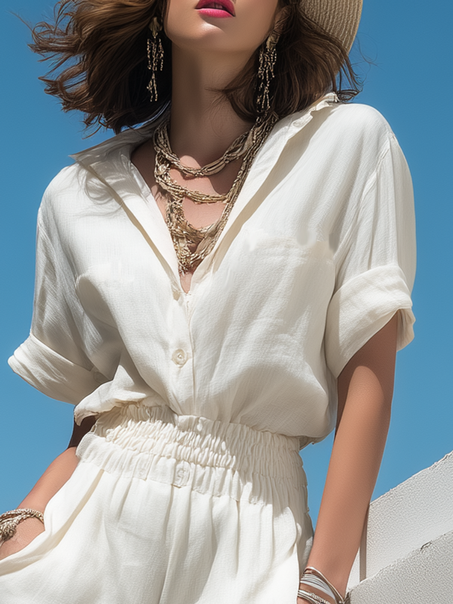 This vacation-inspired set exudes a fresh, breezy charm. It features a white, short-sleeve V-neck top paired with matching shorts in the same color tone, allowing you to effortlessly create a stylish and elegant summer look. The top is crafted from a lightweight, breathable fabric; its relaxed silhouette complements the face-flattering neckline design, presenting a look of simple yet refined elegance. The accompanying shorts feature either an elastic waistband or a drawstring closure, ensuring a comfortable fit and unrestricted movement. Whether you are strolling along the beach, sightseeing during the day, or simply relaxing at a resort, this outfit is the perfect choice.