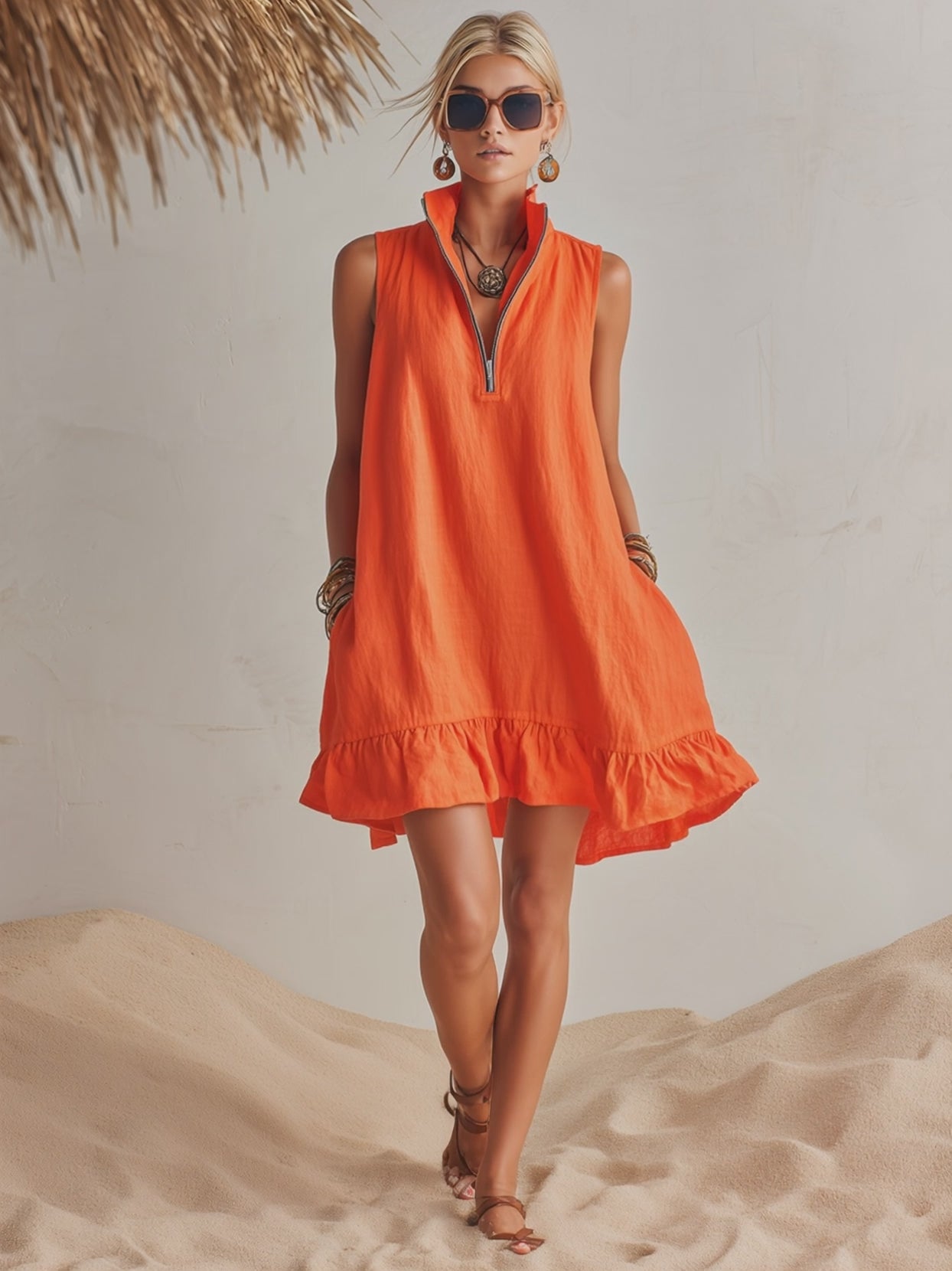 This lightweight mini dress blends refreshing comfort with a playful vacation vibe. Made from a breathable cotton-linen blend in a vibrant orange, it features a structured stand collar and an adjustable half-zip neckline. The relaxed silhouette is adorned with flowing ruffles, adding a touch of femininity. Ideal for a warm vacation or everyday summer wear.